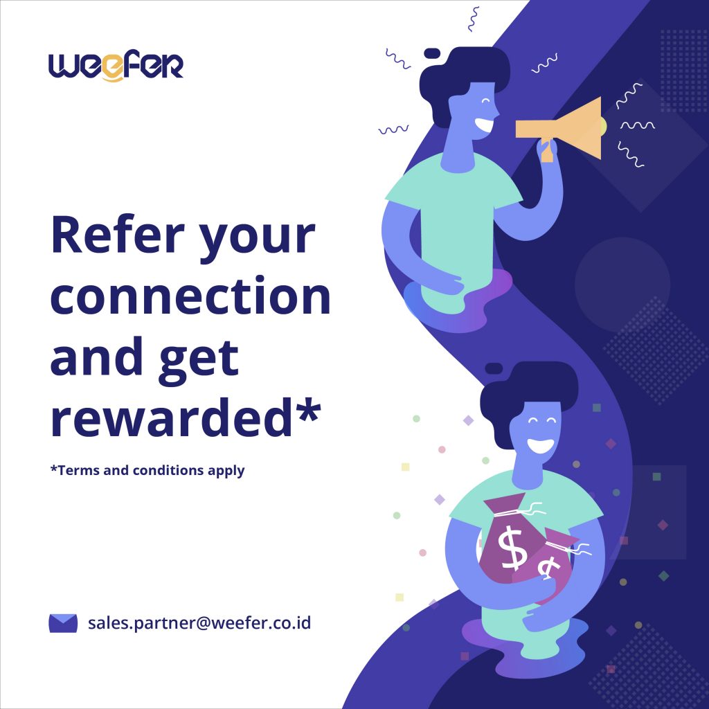 Seiring dengan program referral yang sudah Weefer jalankan sebelumnya dengan hasil yang sangat memuaskan, maka kali ini kami mengajak teman-teman untuk bergabung di program referral ini. Hanya dengan refer teman/kenalan/perusahaan yang tertarik dengan aplikasi yang kami tawarkan, setelah verifikasi dan subscribe maka otomatis mendapatkan bonus. Sungguh mudah bukan? Join disini.