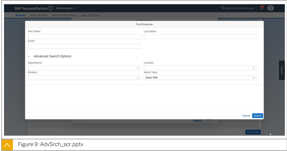 Dalam update kali ini, ketika Anda ingin mencari seorang karyawan di sebuah daftar review, Anda bisa menggunakan fitur Advance Search untuk melakukan pencarian yang lebih spesifik. Fitur Advance Search ini bisa Anda temui, tidak hanya di Universal People Search dialog box, melainkan juga di dialog box “Send a Copy”, “Add Participants”, dan 360 Executive Review.